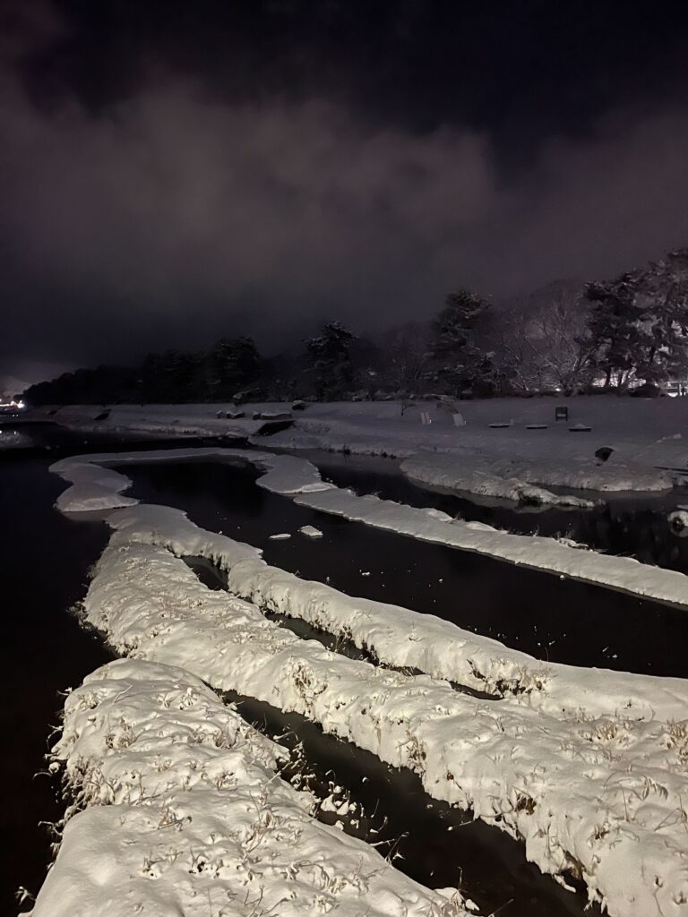 雪は相変わらずしんしんと降る。そういえばそんな名前の深夜喫茶があったなあと思い出す。夜あかりが雪に照り返って昼間よりも明るく感じる。鴨川にあるものに等しく雪が積もって丸みを帯びている。蛇口、ベンチ、石碑、注意喚起の看板。河川環境を整備する角張った設置物たちの輪郭がゆるくなる。歩き続ける。人はいないがひとでないものたちとすれ違う。ゆきだるま、人型の雪跡、かまくら。それらを作った人たちはどこにいったのか。かまくらの中を覗いてみるとあたたかい。室内は思ったより広い間取りで作り手の力量がうかがえる。三人くらいは入れそうだ。部屋の奥にもまだ何かある。童心に帰る恥ずかしさも雪が隠してくれるから有り難い。かまくらからお暇して、すこし走ってみたりしてぜぇぜぇと空気を吐き出す。酸素が喉を濡らす。同じことを考えたのか対岸では数人が雪坂を転がっていく。悲鳴と歓びが混じった声を聞く。雪は大人の輪郭もまるくしてくれるらしい。風邪をひかないようにね。音が戻ってきたことに気づく。そろそろ電話をかけても繋がりそうなので再び川端通りへ戻る。電話するよりも先に蕎麦屋で待つ友人から気遣いのメッセージが入る。あたたかい蕎麦が待っている。行く、と伝える。