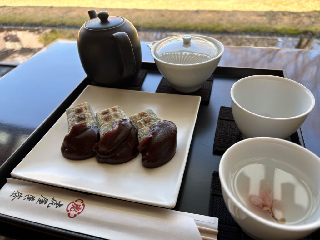 茶を蒸らしている間に、よもぎ餅をひとつ。ゆっくり焼かれているのだろう。餅がとろりとして、こし餡と口の中でやわらかく混ざり合う。添えられた桜湯をひと口含み、ゆっくりと深呼吸をする。